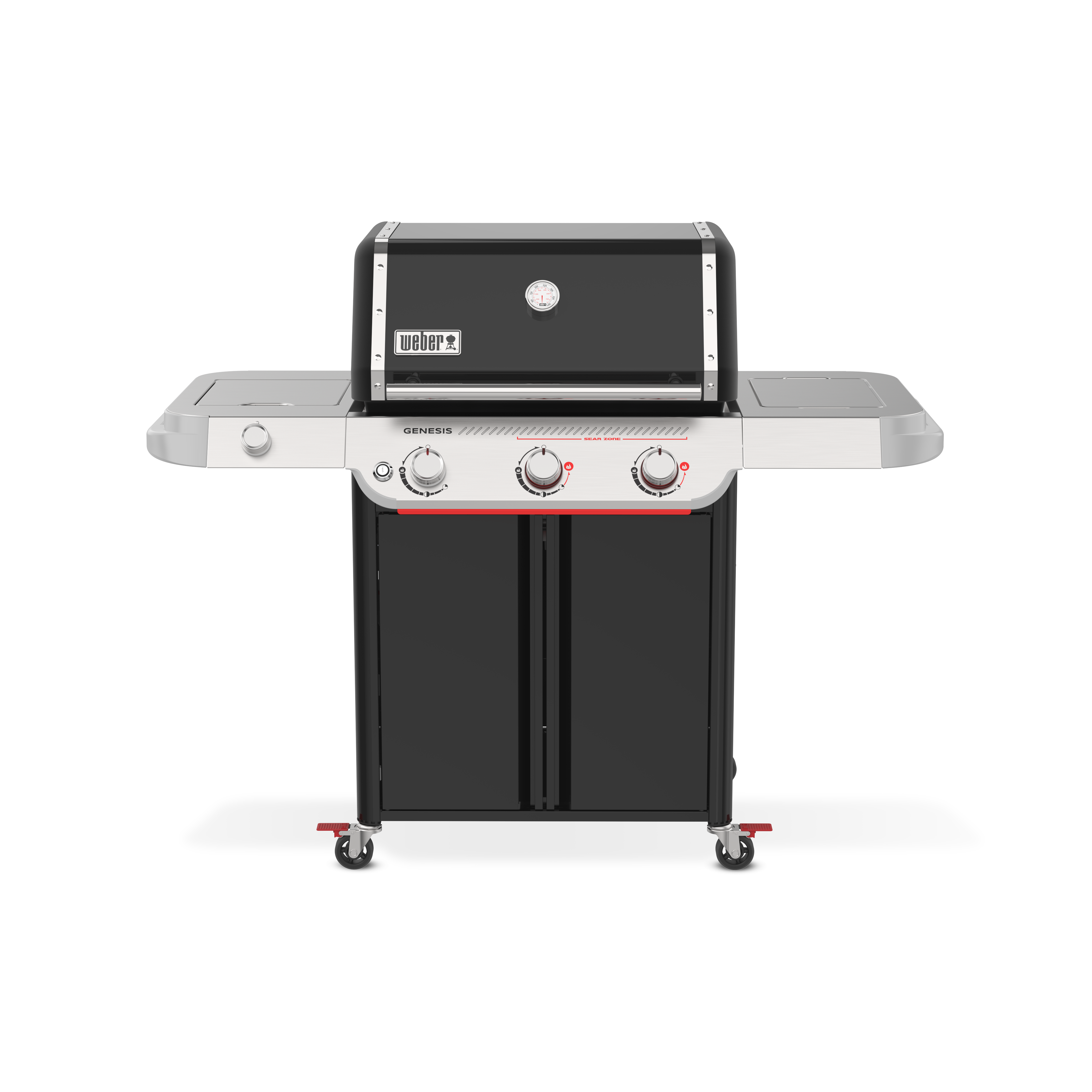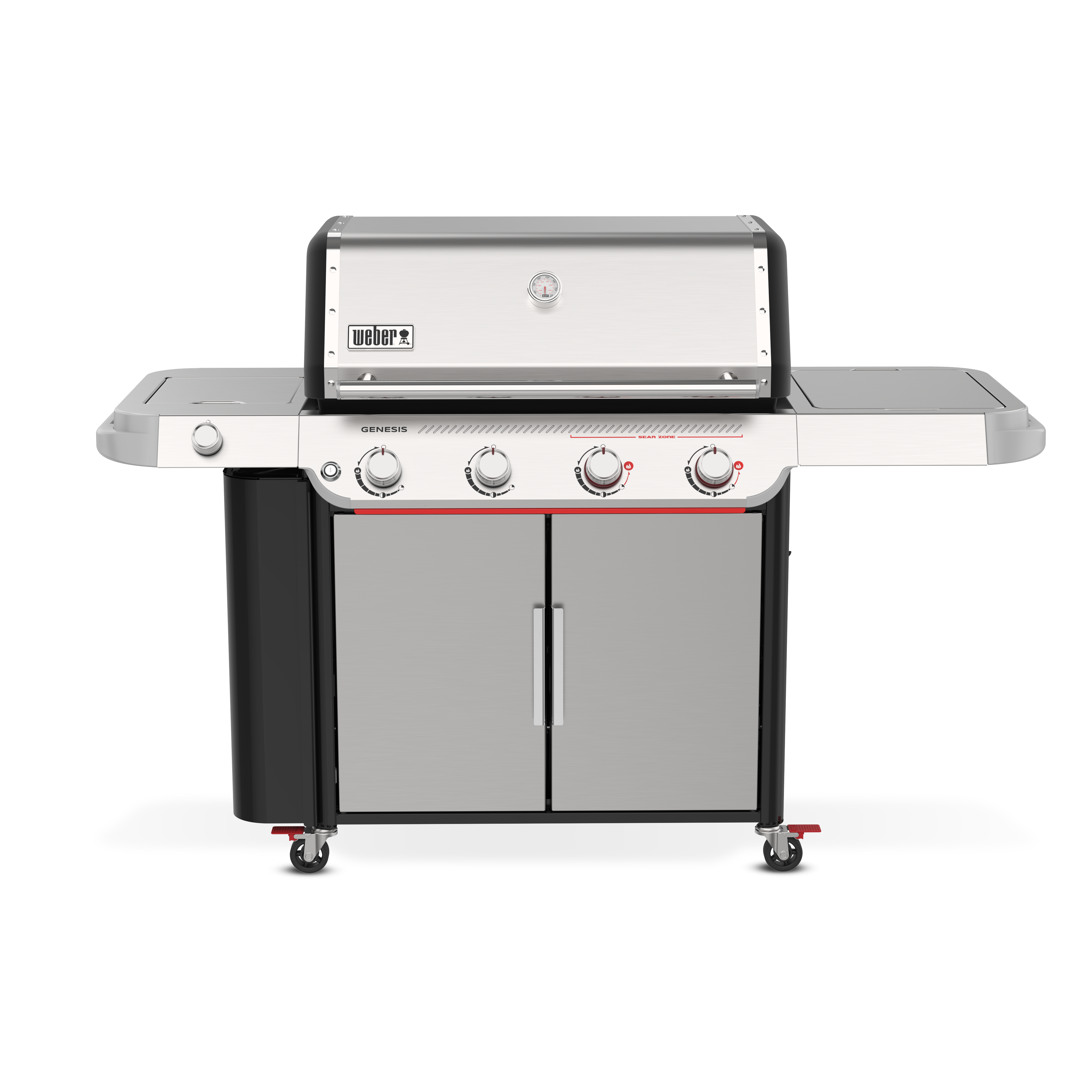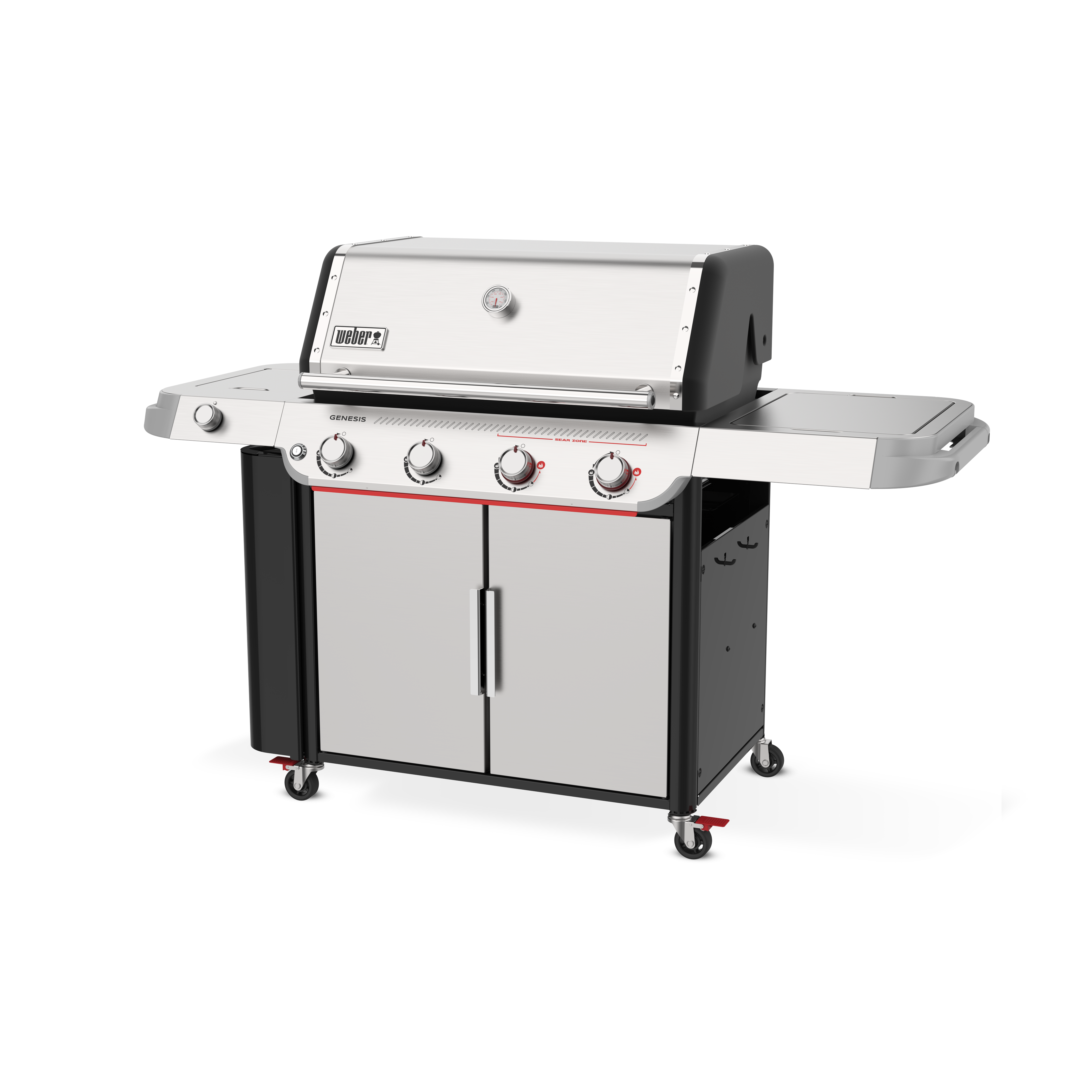 Experience powerhouse performance and precision with the upgraded Weber® Genesis® SP-435 Gas Barbecue. This premium 4-burner outdoor entertaining barbecue is perfect for large families or anyone looking for plenty of space, power and cooking versatility. Featuring a Sear Zone, side burner, grill locker, and Weber Crafted® griddle, it’s sure to be the centrepiece of your backyard. An ultra-hot Sear Zone, powered by two dual-row PureBlu™ burners, reaches ~400ºC for impressive restaurant-quality searing. The spacious cooking area heats up fast and evenly, thanks to the premium PureBlu™ burners. Heavy-duty porcelain-enamelled, cast-iron cooking grills flip over to fit Weber Crafted® cookware, giving you ultimate cooking versatility by transforming your barbecue with a griddle, pizza stone, veggie basket, and more . Plus, with Weber Works™ interchangeable accessories that drop in or snap onto the side tables, you can store, carry, prep, and serve seamlessly.