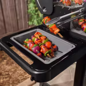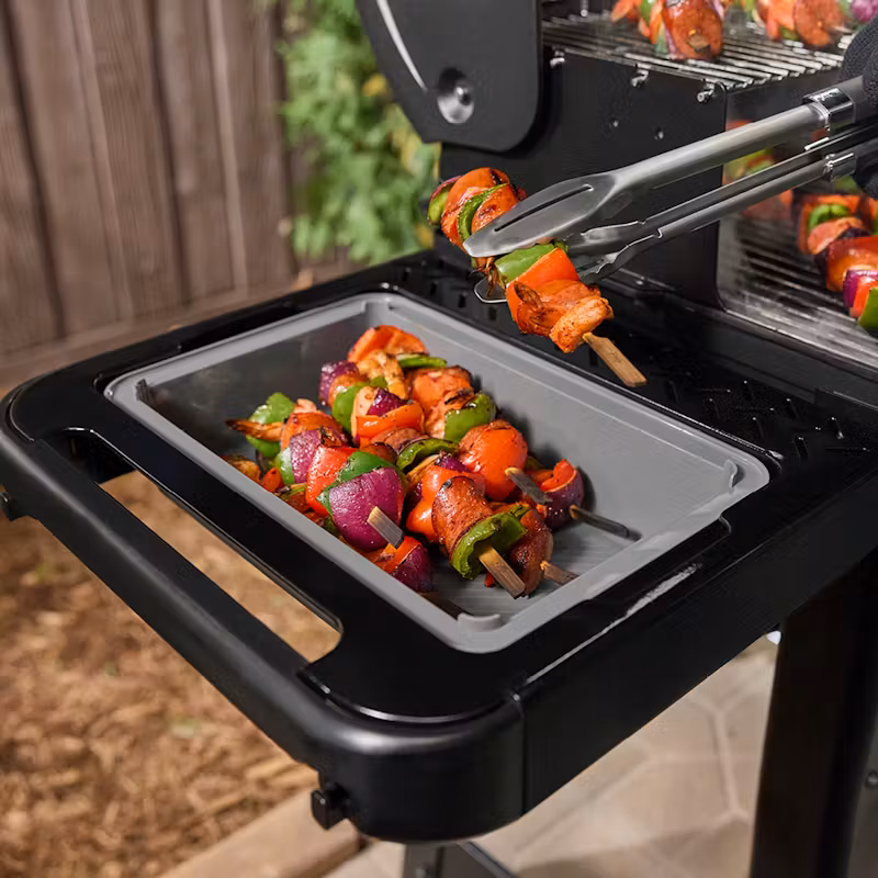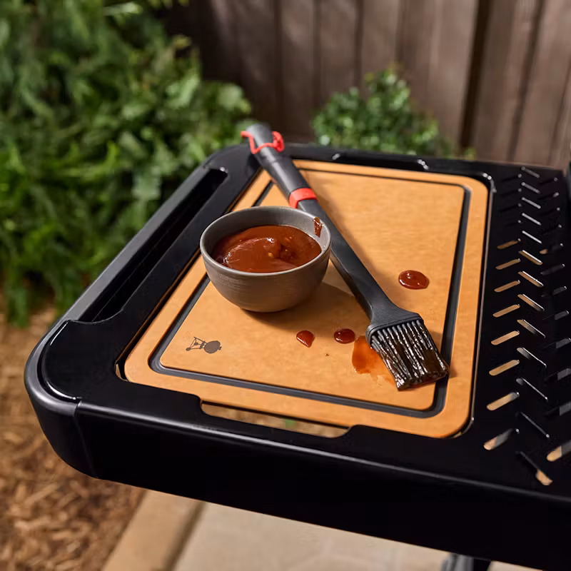 • Includes a 2-sided cutting board with a juice-catching groove that drops into the side table’s centre opening, perfect for easy chopping and carving right at the barbecue or smoker